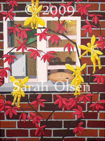 line in the trees, door, grass, and unicorn's legs add to the sense of